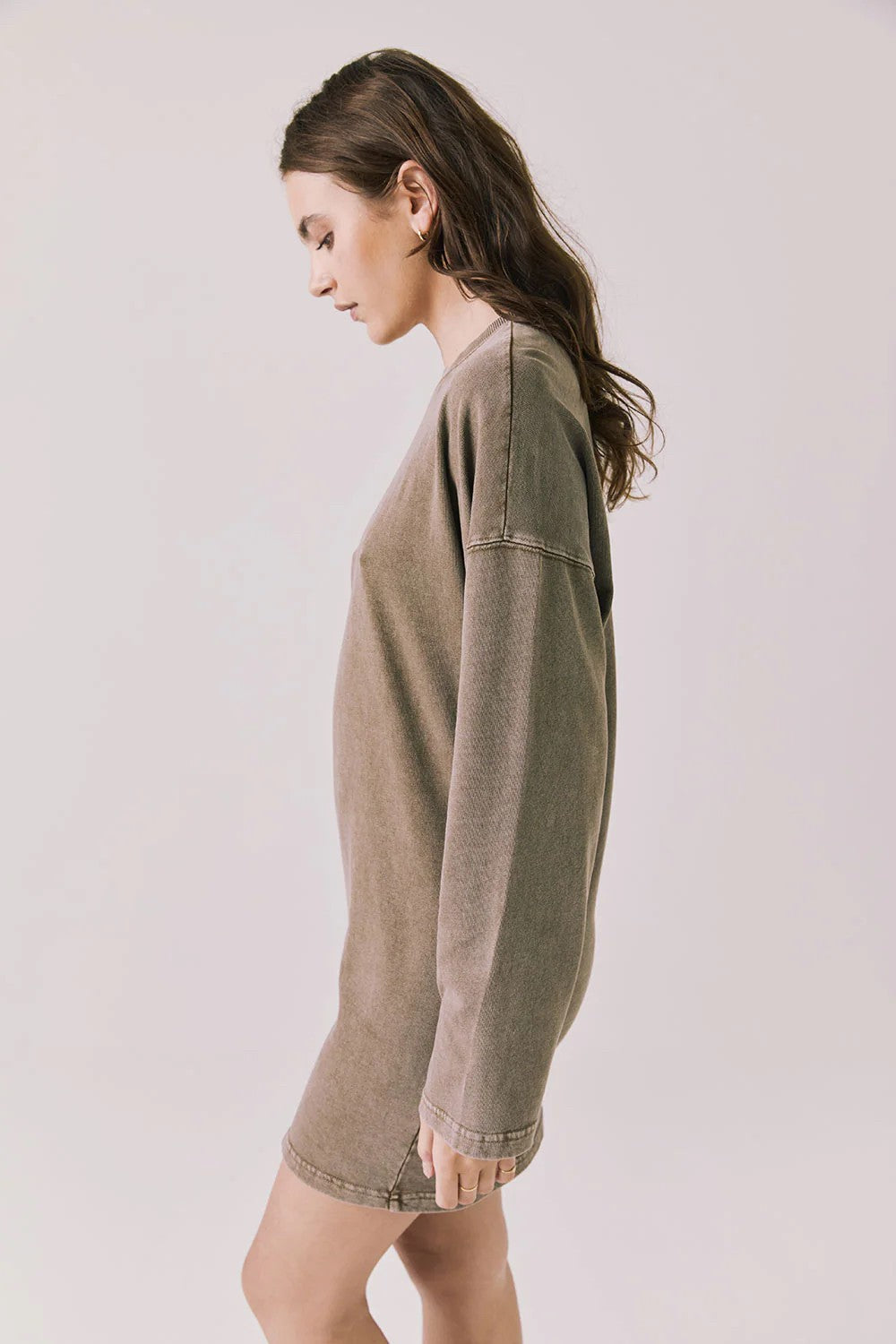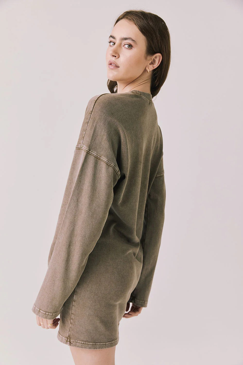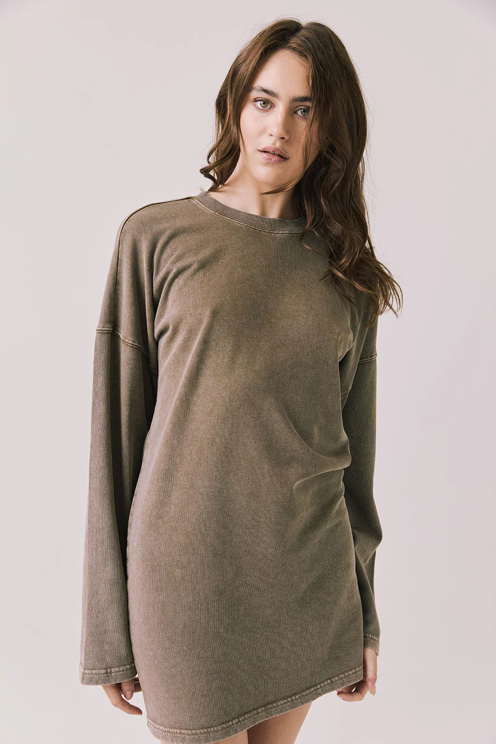 The Margarita Mini Dress in Ginger Brown features a classic sweater dress silhouette with a slouchy fit and high neckline for effortless cool.