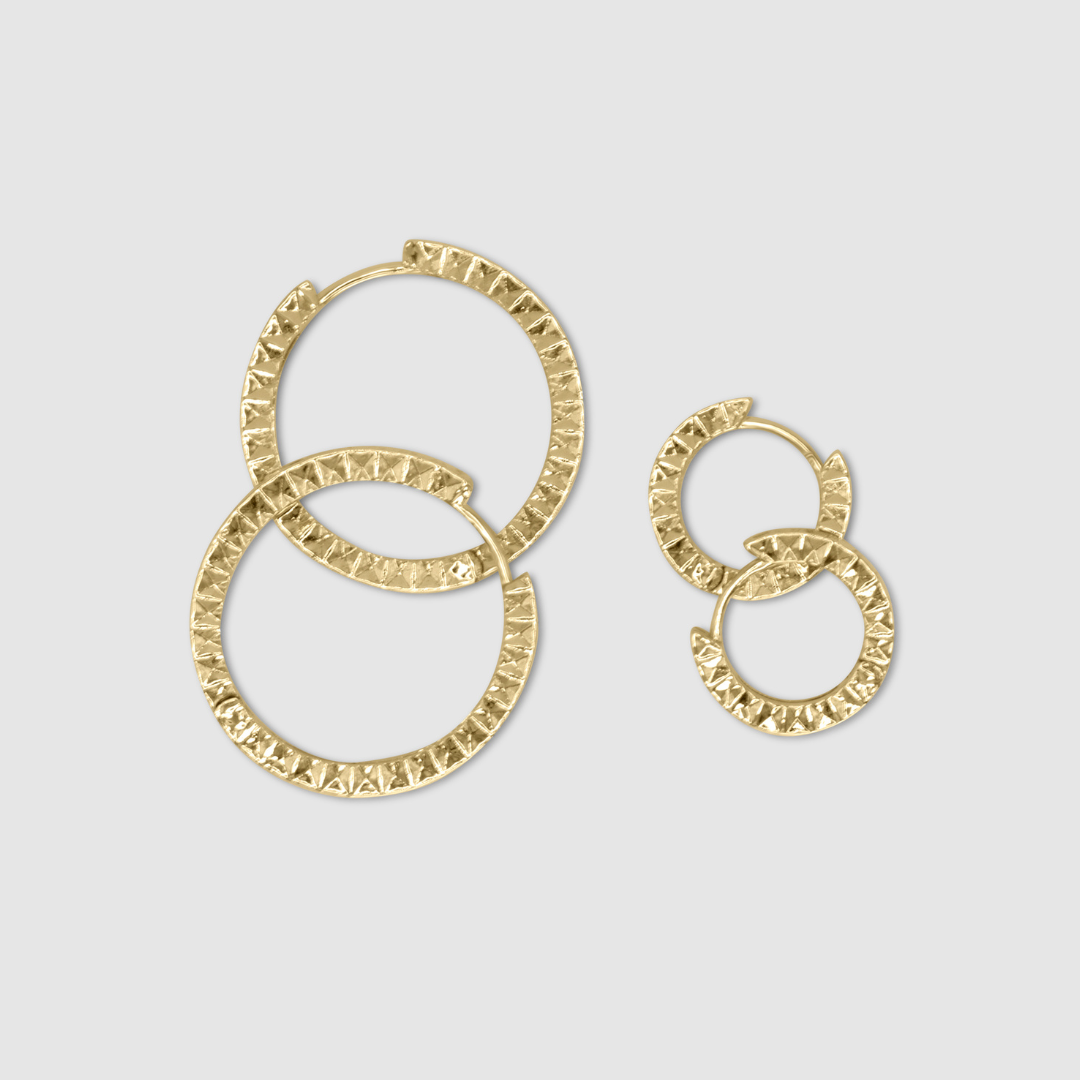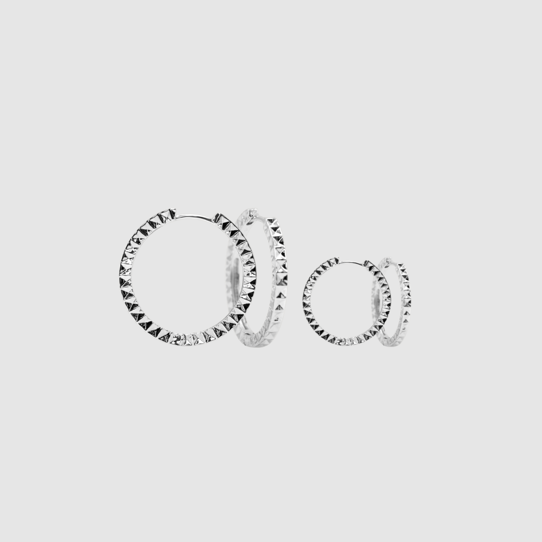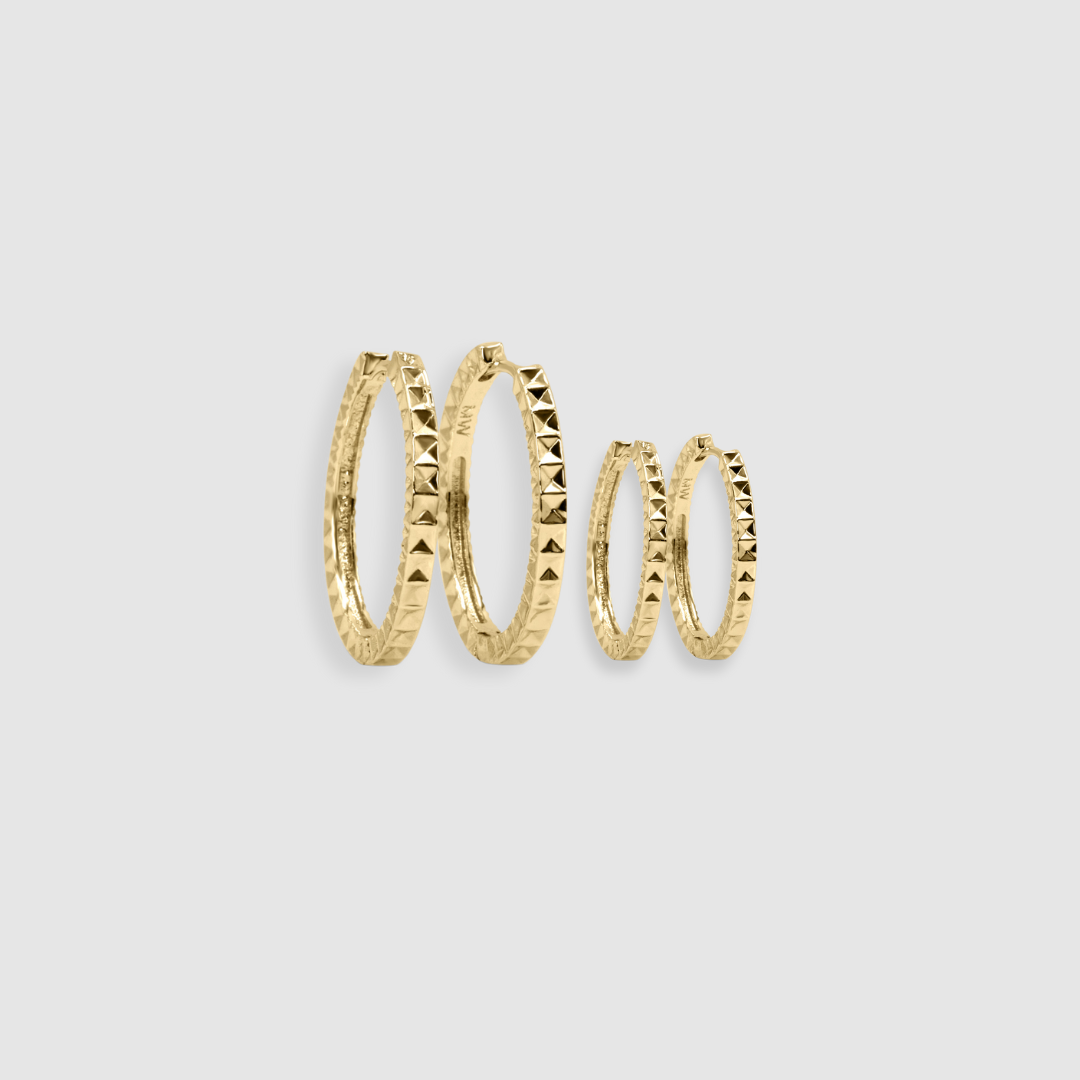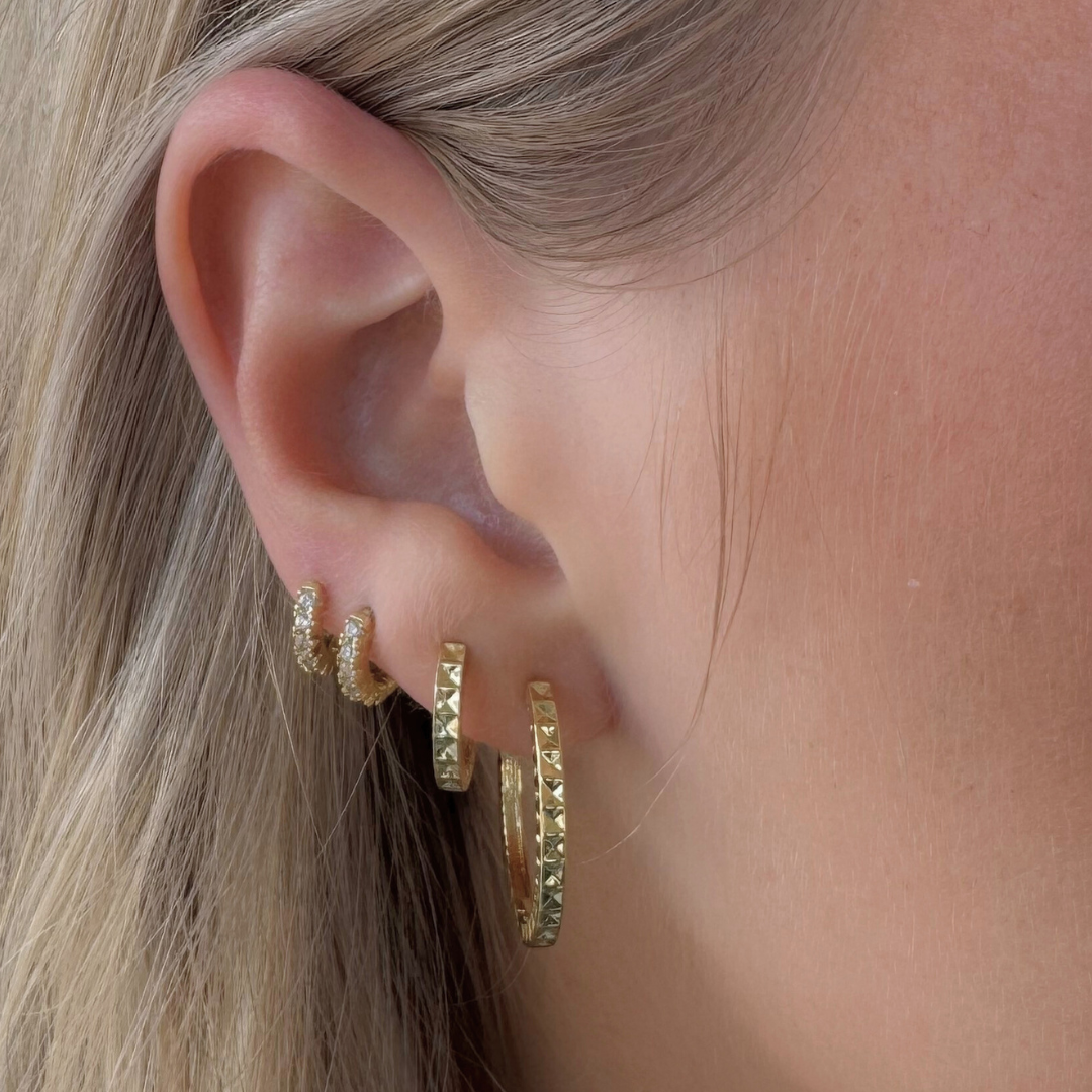Introducing Baby Prism Huggies, these unique pyramid-shaped huggies add the perfect amount of edge and class. Stack them together or wear on their own for different size looks.